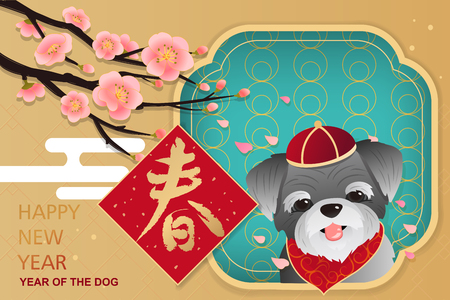 かわいい漫画は 犬のイメージと中国語の言葉で春と新年のデザインを幸せにします のイラスト素材 ベクタ Image